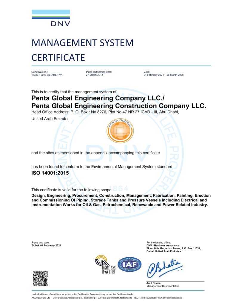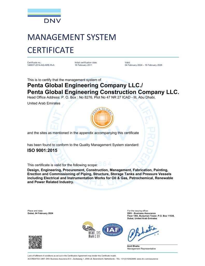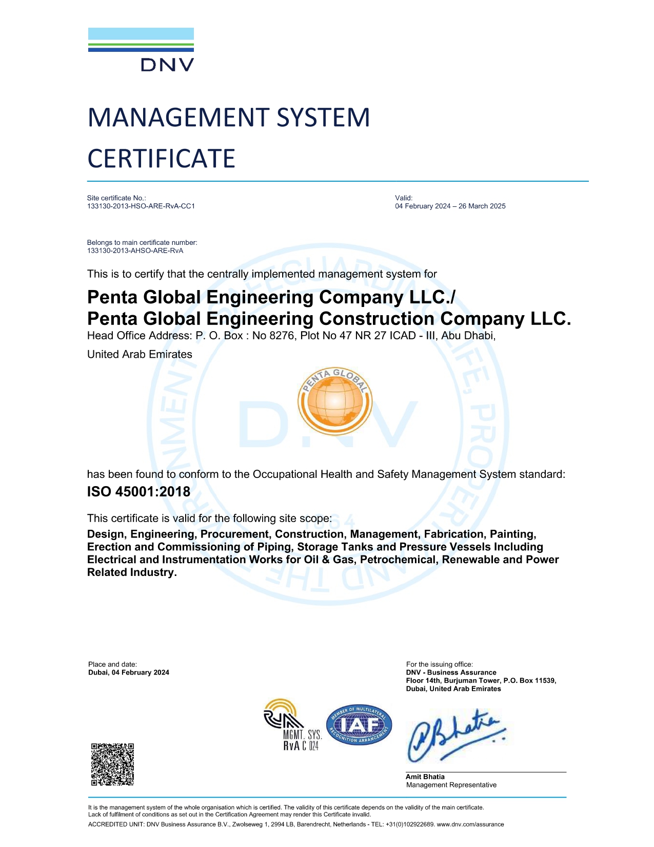 Penta Global’s Core Activities are Management of Construction service and undertaking construction work for our client in the field o Oil, Petrochemical, Power and other Industrial Sectors.Our long-term success depends on our ability to continuously improve our service delivery while protecting our people and the environment in which we work.We Believe that Quality,Health, Safety and Environment is the responsibility of each and every employee and is of utmost significance of the company.Our Quality, Health, Safety and Environment Management system embodies the prime objective of customer satisfaction by ensuring the organizational, commercial and technical activities are planned, managed and supervised to full fill contractual requirement.We deliver our HSE responsibilities and ensure our employees are equipped and trained to achieve our goal of Zero incidents, injuries and illnesses.We continuously seek to reduce the Environmental footprint of our operations and related activities by disposing wastes safely and responsibly after taking measures to reuse & recycle. Also minimize emissions, discharges and waste generation to environment and commit to prevention of pollution.To assess all operational activities and potential changes, to identify significant Hazards or Environmental impacts and to implement appropriate measures to ensure that exposure to such risk are maintained to minimum as reasonably practicable and to strive to prevent the occurrence of accident or exposures, that could harm or damage, to individuals including the public or the Environment.Further, we also ensure that we are fully aware of statutory and regulatory requirements, needs of our customers and strive to exceed their expectations.“We Cultivate Teamwork and Encourage Employee Participation in Striving for Continual Improvement of Quality, Health, Safety and Environmental system.”“The QHSE policy will be integrated at all levels of our company and is the responsibility of management with the active support of all our staff.””Quality and Safety are our values, not our Priorities- Priorities change but values don’t” – Date: 31-01-2022